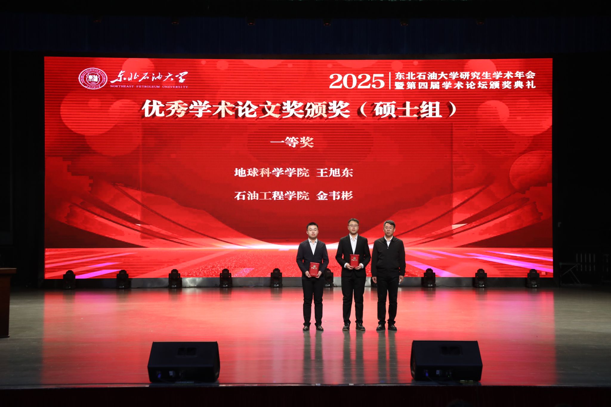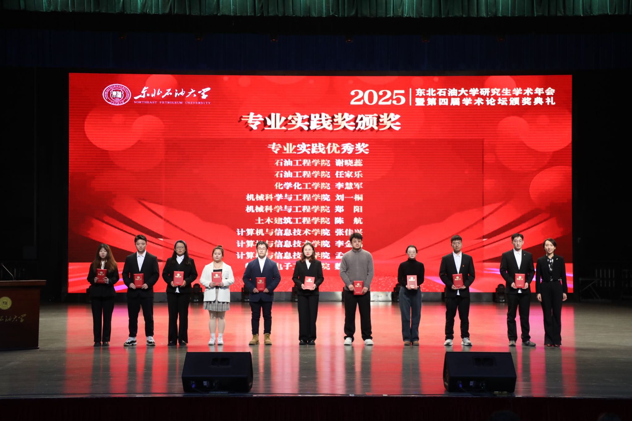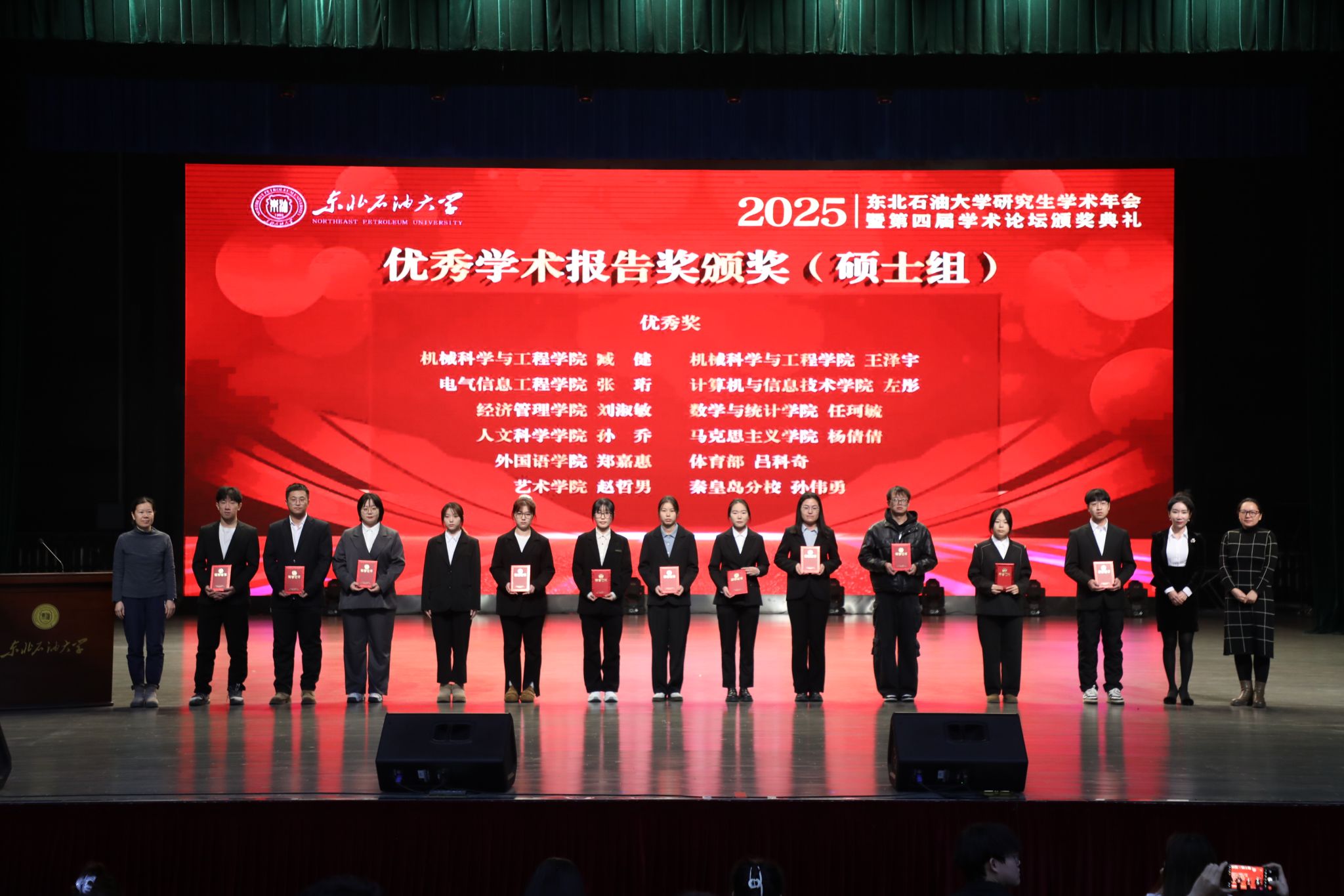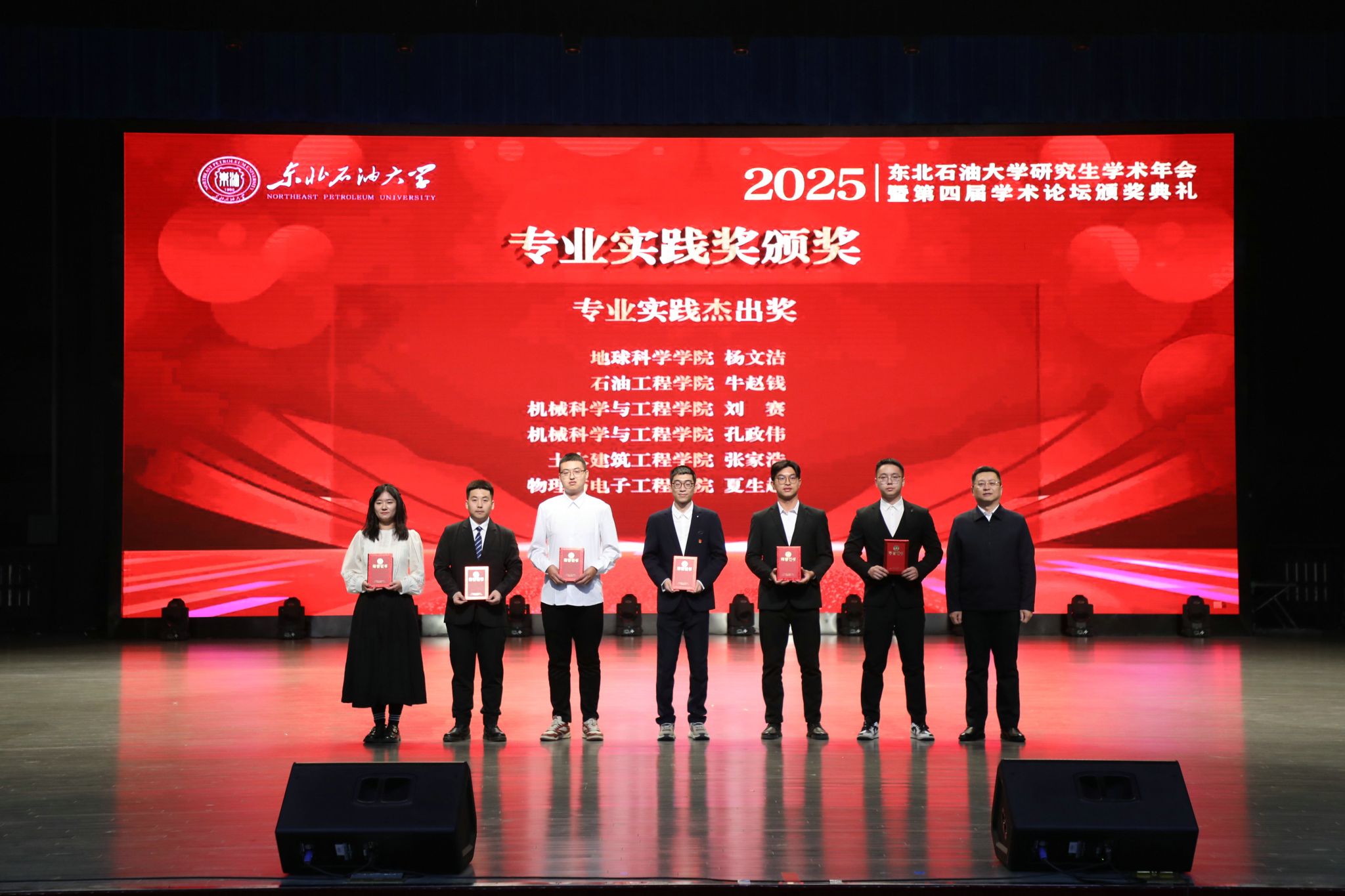 专业实践杰出奖获奖代表、石油工程学院硕士研究生牛赵钱,优秀学术报告奖获奖代表、新能源与材料学院博士研究生乔志强在闭幕式上作经验分享。