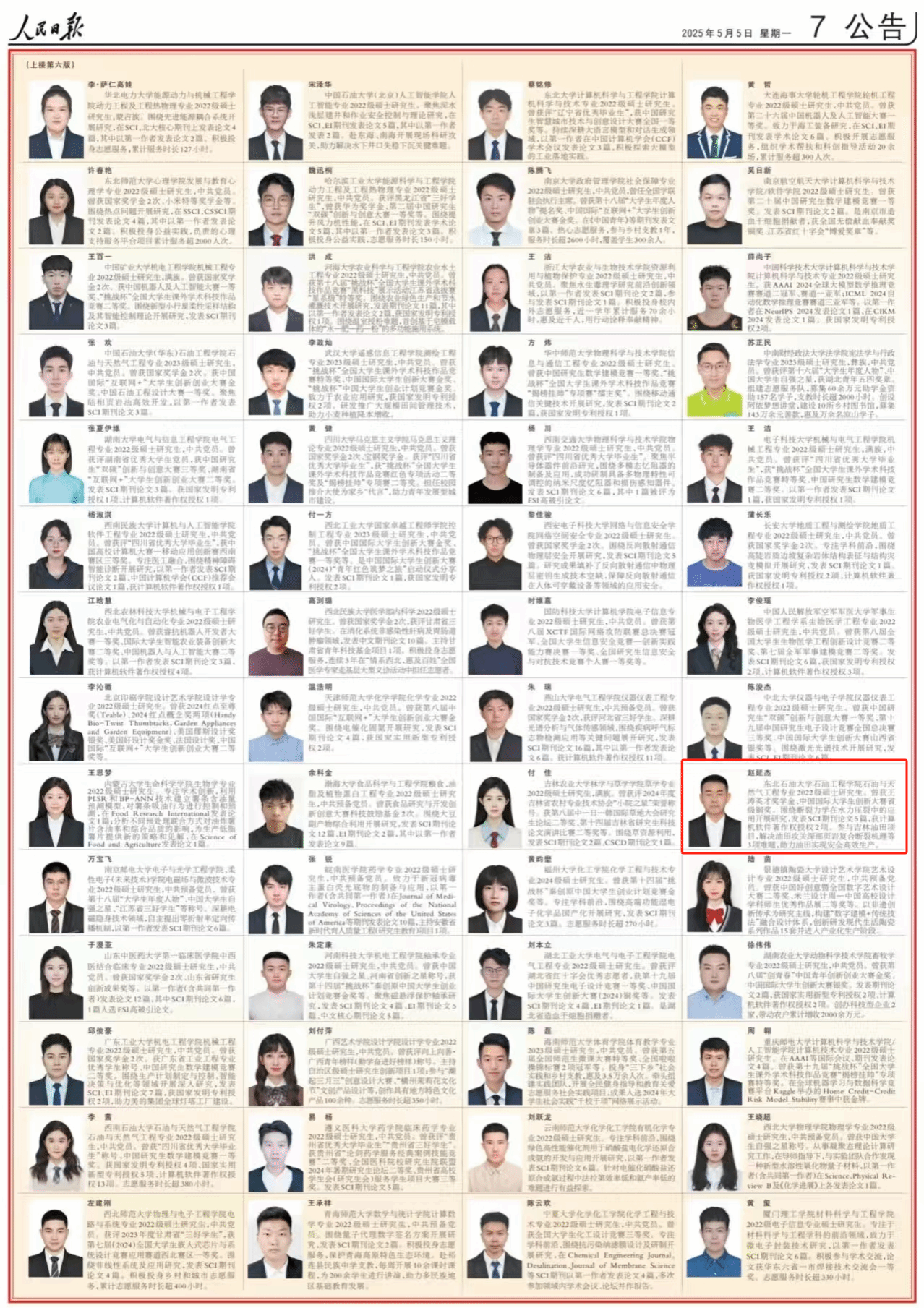 5月5日,《人民日报》刊登《2024年研究生国家奖学金获奖学生代表名录》,我校石油工程学院硕士研究生赵延杰入选名录。这是近三年内东油学子第二次、研究生学子第一次登榜。