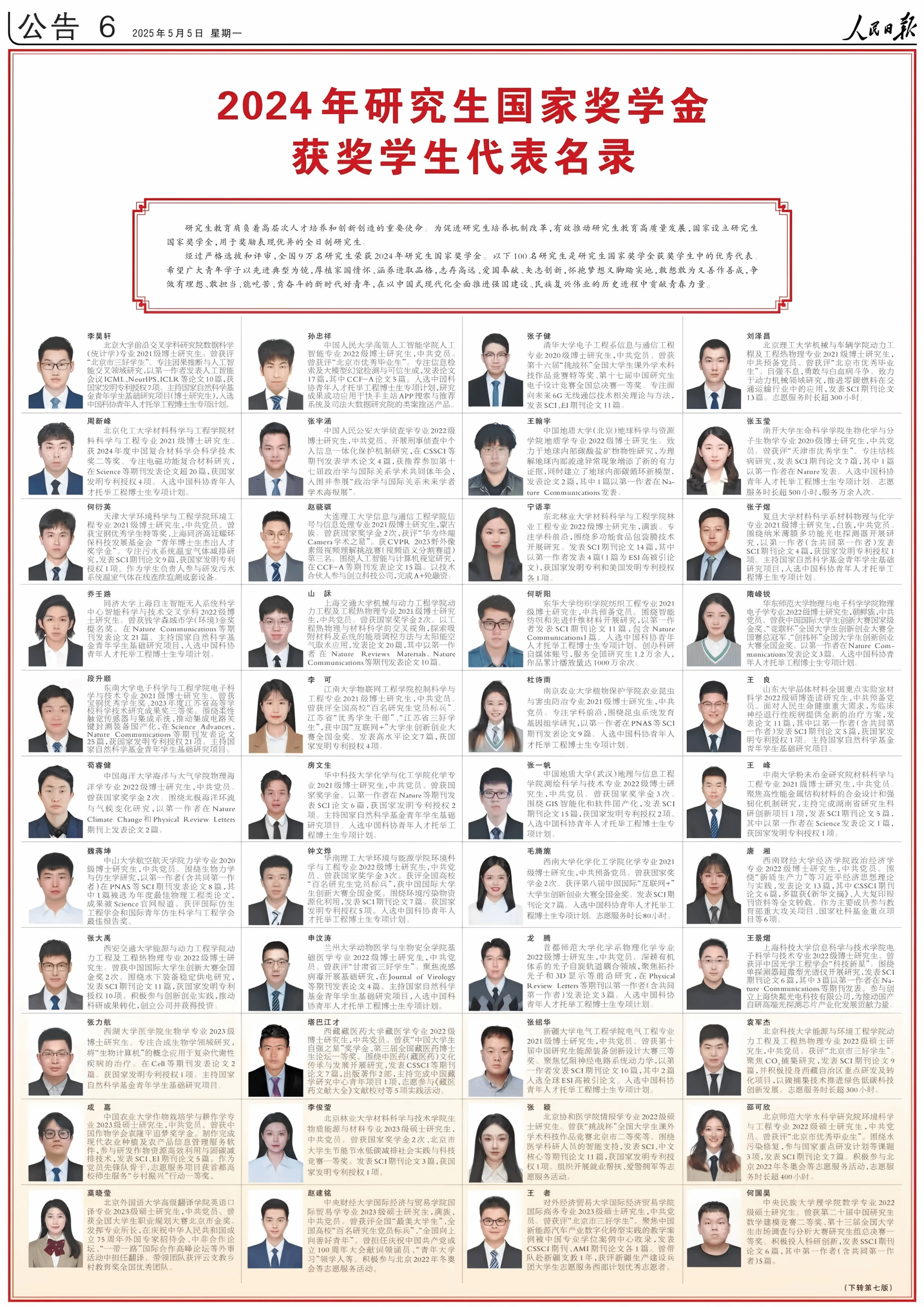 研究生教育肩负着高层次人才培养和创新创造的重要使命。为促进研究生培养机制改革,推动研究生教育高质量发展,国家设立研究生国家奖学金,用于奖励表现优异的全日制研究生。经过严格选拔和评审,全国9万名研究生荣获2024年研究生国家奖学金,登榜的100名研究生是研究生国家奖学金获奖学生中的优秀代表。